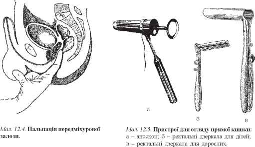 Виконують пальпацію передміхурової залози (розміри, консистенція, ущільнення, флуктуація) (мал. 12.4) і матки.